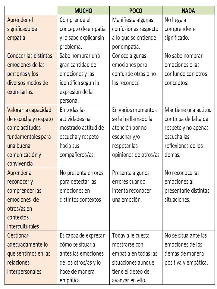 Para este momento se opta primero por una autoevaluación, ya que es necesario detectar el grado de empatía que cada persona individualmente siente y se completará con una evaluación docente centrada en la consecución de los objetivos propuestos.